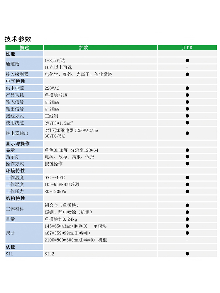 | JUDD型單通道氣體檢測控制器為標(biāo)準(zhǔn)模塊式控制器,每個模塊均具備獨立顯示功能,根據(jù)接入數(shù)量的不同,可分為壁掛式和機(jī)柜式??刂破鲀?nèi)置開關(guān)量輸出,可配接4-20mA信號AG系列有毒氣體,適用于石油、化工、能源、鋼鐵、冶金、燃?xì)獾刃袠I(yè)。 |